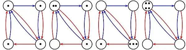Le calcul des rangs s'illustre bien par un jeu à jetons[7]. Au départ, chaque état contient un jeton. À l'application d'une lettre R ou B, les jetons se déplacent d'un état au suivant selon la couleur. Après une séquence de lettres , chaque état contient des jetons dont le nombre est le nombre d'états qui sont envoyés sur cet état par . Le fait qu'à la fin tous les jetons se trouvent dans un même état exprime précisément que le mot employé est synchronisant.