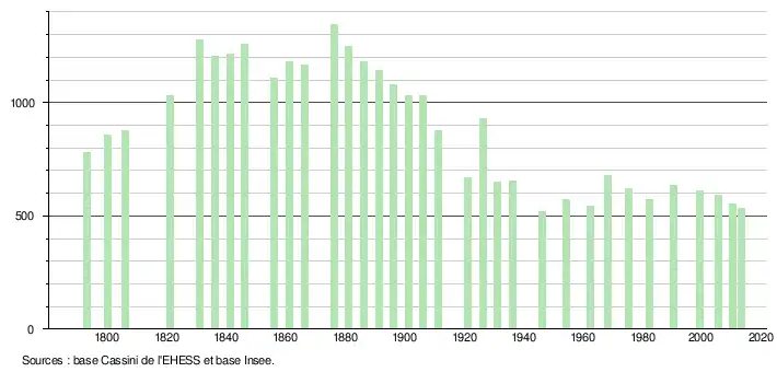 L'évolution du nombre d'habitants est connue à travers les recensements de la population effectués dans la commune depuis 1793. À partir du , les populations légales des communes sont publiées annuellement dans le cadre d'un recensement qui repose désormais sur une collecte d'information annuelle, concernant successivement tous les territoires communaux au cours d'une période de cinq ans. Pour les communes de moins de 10 000 habitants, une enquête de recensement portant sur toute la population est réalisée tous les cinq ans, les populations légales des années intermédiaires étant quant à elles estimées par interpolation ou extrapolation[6]. Pour la commune, le premier recensement exhaustif entrant dans le cadre du nouveau dispositif a été réalisé en 2005[7],[Note 1].
