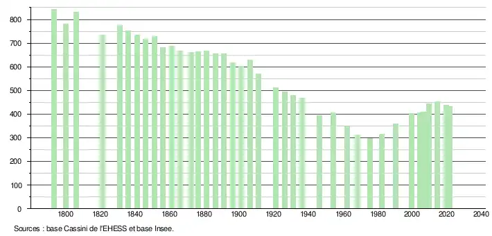 L'évolution du nombre d'habitants est connue à travers les recensements de la population effectués dans la commune depuis 1793. Pour les communes de moins de 10 000 habitants, une enquête de recensement portant sur toute la population est réalisée tous les cinq ans, les populations légales des années intermédiaires étant quant à elles estimées par interpolation ou extrapolation[12]. Pour la commune, le premier recensement exhaustif entrant dans le cadre du nouveau dispositif a été réalisé en 2004[13].