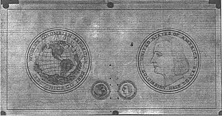 | Gravure | Vue du Santa María au-dessus de deux hémisphères et flanqué par la date 1492. "World's Columbian Exposition Chicago" encercle le bord avec la date de frappe en-bas. | |