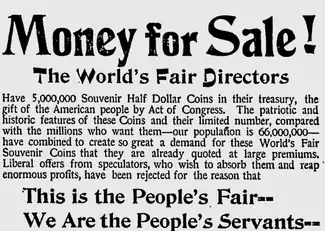Les ventes durant la foire elle-même allaient jusqu'à la construction d'une reproduction du bâtiment du trésor à Washington D.C. à partir de demi dollars 20 pieds (6,1 m) de long et 4 pieds (1,2 m) de haut. Ces pièces étaient vendues, mais ne pouvait pas être réclamées avant la fin de la foire[24]. En , les dirigeants de la foire ont empilé des demi dollars pour créer une réplique du Washington Monument de 22 pieds (6,7 m) de haut[24][30]. Quand la foire ferma en octobre, de nombreuses pièces restèrent dans les mains des organisations, le Trésor et les banques de Chicago. Seulement 358 645 pièces ont été vendues au prix d'un dollar[30].
