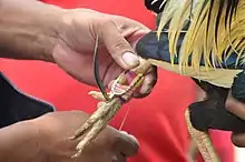 Elle consiste à mettre, dans une sorte de ring circulaire, deux coqs dont les ergots sont coupés et remplacés par des ergots en corne (plus longs et affûtés) ou en acier[16]. Les deux coqs sont présentés face à face et se battent, des paris sont pris sur le vainqueur[17],[18].