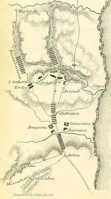 Au même moment, le maréchal Suchet a quitté Molins de Rei avec 12 000 soldats. Une deuxième colonne française forte de 7 000 hommes, sous les ordres du général de division Charles Mathieu Isidore Decaen, part de Martorell et s'avance par le sud-ouest. Son objectif est le même que celui de Suchet : attaquer le gros de l'armée de Bentinck à Vilafranca[10].