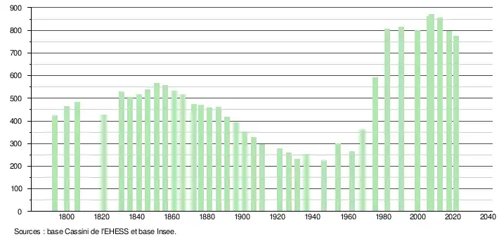 L'évolution du nombre d'habitants est connue à travers les recensements de la population effectués dans la commune depuis 1793. Pour les communes de moins de 10 000 habitants, une enquête de recensement portant sur toute la population est réalisée tous les cinq ans, les populations légales des années intermédiaires étant quant à elles estimées par interpolation ou extrapolation[15]. Pour la commune, le premier recensement exhaustif entrant dans le cadre du nouveau dispositif a été réalisé en 2007[16].