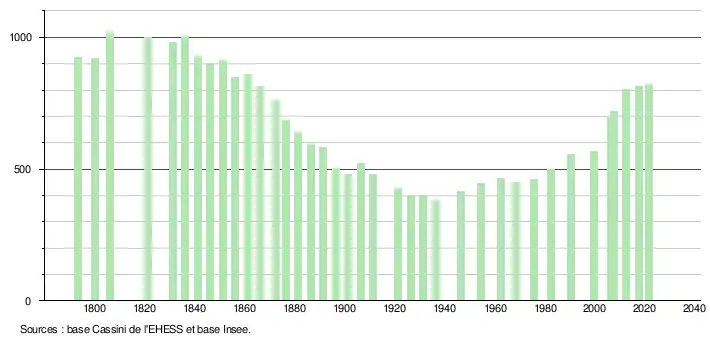 L'évolution du nombre d'habitants est connue à travers les recensements de la population effectués dans la commune depuis 1793. Pour les communes de moins de 10 000 habitants, une enquête de recensement portant sur toute la population est réalisée tous les cinq ans, les populations légales des années intermédiaires étant quant à elles estimées par interpolation ou extrapolation[18]. Pour la commune, le premier recensement exhaustif entrant dans le cadre du nouveau dispositif a été réalisé en 2007[19].