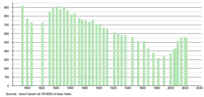 L'évolution du nombre d'habitants est connue à travers les recensements de la population effectués dans la commune depuis 1793. Pour les communes de moins de 10 000 habitants, une enquête de recensement portant sur toute la population est réalisée tous les cinq ans, les populations légales des années intermédiaires étant quant à elles estimées par interpolation ou extrapolation[23]. Pour la commune, le premier recensement exhaustif entrant dans le cadre du nouveau dispositif a été réalisé en 2004[24].