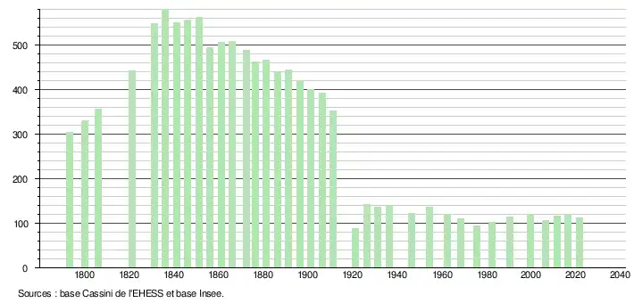 L'évolution du nombre d'habitants est connue à travers les recensements de la population effectués dans la commune depuis 1793. Pour les communes de moins de 10 000 habitants, une enquête de recensement portant sur toute la population est réalisée tous les cinq ans, les populations légales des années intermédiaires étant quant à elles estimées par interpolation ou extrapolation[18]. Pour la commune, le premier recensement exhaustif entrant dans le cadre du nouveau dispositif a été réalisé en 2006[19].
