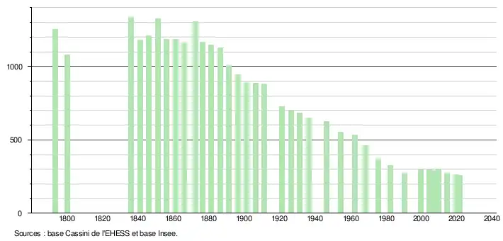 L'évolution du nombre d'habitants est connue à travers les recensements de la population effectués dans la commune depuis 1793. Pour les communes de moins de 10 000 habitants, une enquête de recensement portant sur toute la population est réalisée tous les cinq ans, les populations légales des années intermédiaires étant quant à elles estimées par interpolation ou extrapolation[47]. Pour la commune, le premier recensement exhaustif entrant dans le cadre du nouveau dispositif a été réalisé en 2004[48].