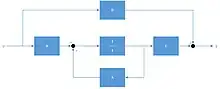 Le système ci-dessus n'a pas une représentation d'état linéaire du fait des signaux et . Une manière de les éliminer consiste à dériver les deux équations, et à choisir comme nouvel état et comme nouvelle entrée[13],[1].