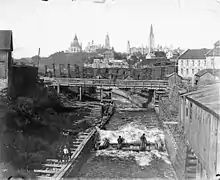 Également en 1869, environ un tiers du bois d'œuvre fabriqué à Ottawa est expédié à l'étranger, et la région emploie 6 000 hommes à l'abattage et au flottage des grumes, environ 5 500 à la préparation de bois équarri destiné aux marchés européens et environ 5 000 aux usines de Ottawa. [8]
