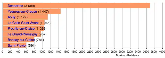 En terme démographique, la commune de Descartes domine largement la CCTS avec un nombre d'habitants représentant près de 25 % de la population de l'EPCI. Elle est suivie par Yzeures-sur-Creuse avec près de 10 % puis par quatre communes représentants chacune près de 7 % (Abilly, La Celle-Saint-Avant, Preuilly-sur-Claise et Le Grand-Pressigny).