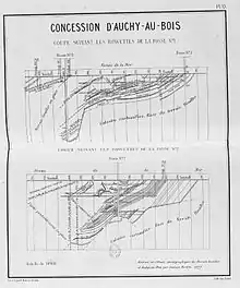 L'ouvrage de M. Breton, dont sont extraits les renseignements qui précèdent, montre que l'axe de fond du bassin houiller inclinait vers l'est, lors du dépôt du terrain houiller et explique de cette manière comment le gisement d'Auchy-au-Bois, quoique reposant directement sur le calcaire carbonifère, ne renferme cependant pas les couches inférieures de la formation houillère[C 14]. D'après le rapport du conseil d'administration à l'assemblée générale du 28 avril 1879, on a recoupé par les travaux de la fosse no 3, dix veines présentant, d'après leur ordre de superposition, les épaisseurs suivantes : première veine, Présidente, trois mètres d'épaisseur en charbon, deuxième veine, Ernest, un mètre, troisième veine, Jules, 60 centimètres, quatrième veine, Alphonse, un mètre, cinquième veine, François, 80 centimètres, sixième veine, Louise, 60 centimètres, septième veine, Anne-Marie, 1,20 mètre, huitième veine, Zoé, 60 centimètres, neuvième veine, Charles-Eugène, un mètre, dixième veine, Guillaume, dont la puissance est encore indéterminée, soit un total de 9,80 mètres en charbon[C 14].