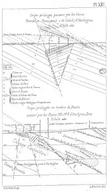 - 1° La première passe au tourtia à 760 mètres au midi du puits, son inclinaison est de 75° au sud, sa direction nord 57,5° ouest, elle vient s'arrêter à la faille de retour un peu à l'ouest de la fosse no 4[Z 10]. Au no 1, elle enfonce les couches de plus de cent cinquante mètres au midi, c'est à cause d'elle que la bowette du midi, niveau de 267 mètres, n'a pas recoupé les veines à trois sillons de quarante centimètres et Saint-Augustin. Cette faille continue sur la concession de Ferfay et passe au tourtia, à 37 mètres au sud du puits no 3 de cette compagnie, avec une inclinaison sud de 73°. C'est dans la partie de la veine Élise, à ce puits, comprise entre la voie de fond du couchant, niveau de 243 mètres et cette faille, que l'on a installé l'exploitation en vallée avec traction mécanique[Z 10] ;