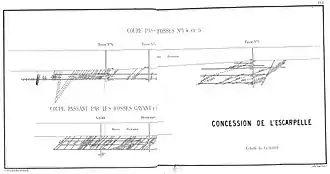 Les coupes ci-contre montrent, avec la carte de la concession de l'Escarpelle la position relative des houilles sèches par rapport aux houilles grasses, la manière dont se comprend le renversement des couches au sud de la fosse no 3 et la relation qui existe entre les veines exploitées à l'Escarpelle et celles exploitées aux fosses Gayant et Bernicourt, de la Compagnie des mines d'Aniche[C 14].