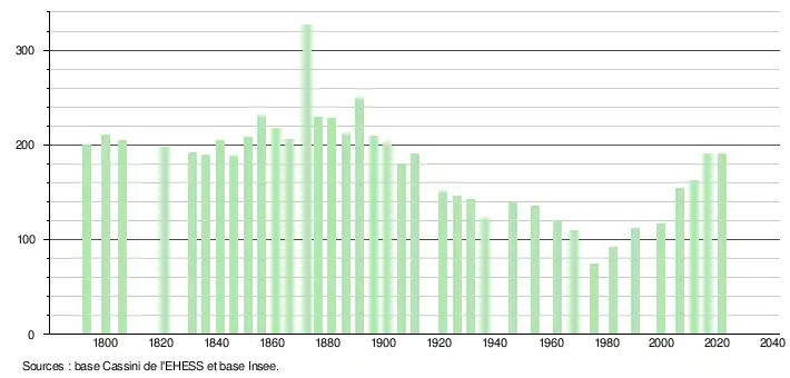 L'évolution du nombre d'habitants est connue à travers les recensements de la population effectués dans la commune depuis 1793. Pour les communes de moins de 10 000 habitants, une enquête de recensement portant sur toute la population est réalisée tous les cinq ans, les populations légales des années intermédiaires étant quant à elles estimées par interpolation ou extrapolation[16]. Pour la commune, le premier recensement exhaustif entrant dans le cadre du nouveau dispositif a été réalisé en 2006[17].