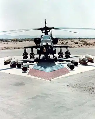Un hélicoptère de combat Apache posant devant l'éventail de sa puissance de feu.