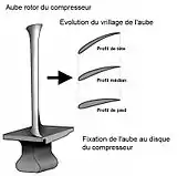 - la section entre le rotor et le carter du compresseur diminue[alpha 2] pour maintenir un flux de fluide constant au fur et à mesure de la compression, et conserver le flux dans le sens axial du moteur.