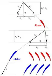 L'image ci-contre décrit le diagramme des vitesses entre le rotor et le stator[2] :