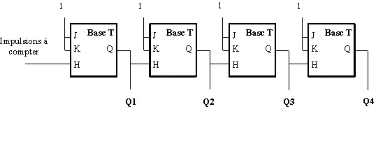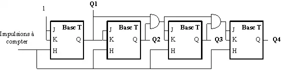 Pour éviter ces problèmes, on modifie la façon de raccorder les bascules. On emploie des bascules JK. Les impulsions à totaliser sont appliquées simultanément aux entrées horloge de toutes les bascules. La première bascule, qui reçoit les impulsions, a ses entrées J et K en permanence à 1 ; elle change donc d'état à chaque impulsion ; les entrées des autres bascules sont pilotées par les sorties des bascules précédentes de façon qu'elles basculent aux moments opportuns : chaque bascule est autorisée à basculer quand toutes les bascules précédentes ont leur sortie à 1.