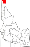 | Boundary | 1915 | La frontière avec le Canada | Bonners Ferry | 10 853 | 3 310 | 3 286 | 24 | 3,3 | -1,1 % | ![]() |