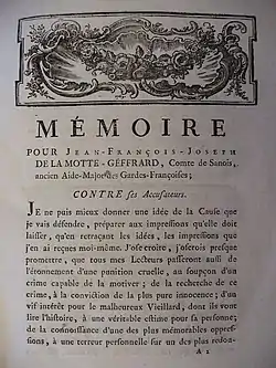 On s’arrache son Mémoire pour le comte de Sanois qui dénonce au passage l’emploi abusif des lettres de cachet. Échappant à toute censure, le mémoire judiciaire (ou factum) est devenu un genre littéraire à la mode. Au départ simple outil de travail rédigé par les avocats à l’intention des juges, c'est maintenant un redoutable moyen de communication qui gagne les salons et les cafés. Grâce à lui, les lecteurs se passionnent pour les causes célèbres comme l’affaire du collier de la reine ou le procès Kornmann.