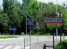 Panneau actuel indiquant 3 fleurs à l'entrée de Grésy-sur-Aix en 2019.