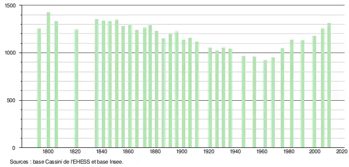 - Dans le tableau des recensements et le graphique, par convention dans Wikipédia, le principe a été retenu, pour les populations légales postérieures à 1999 de n’afficher dans le tableau des recensements et le graphique que les populations correspondant à l'année 2006, première population légale publiée calculée conformément aux concepts définis dans le décret no 2003-485 du 5 juin 2003, et les années correspondant à une enquête exhaustive de recensement pour les communes de moins de 10 000 habitants, ainsi que la dernière population légale publiée par l’Insee.