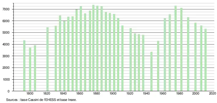 - Dans le tableau des recensements et le graphique, par convention dans Wikipédia, le principe a été retenu, pour les populations légales postérieures à 1999 de n’afficher dans le tableau des recensements et le graphique que les populations correspondant à l'année 2006, première population légale publiée calculée conformément aux concepts définis dans le décret no 2003-485 du 5 juin 2003, et les années correspondant à une enquête exhaustive de recensement pour les communes de moins de 10 000 habitants, ainsi que la dernière population légale publiée par l’Insee.