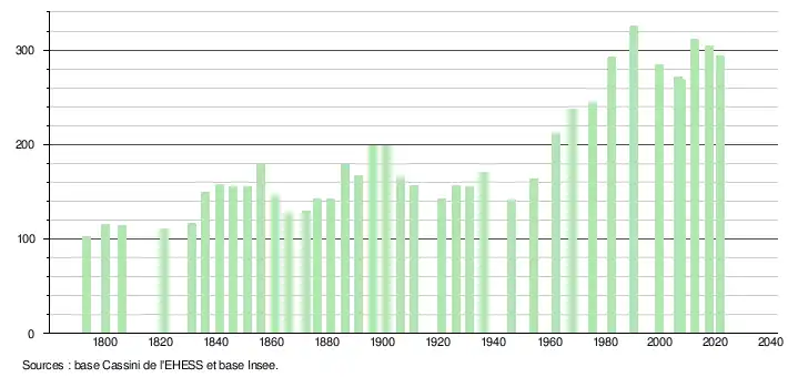 L'évolution du nombre d'habitants est connue à travers les recensements de la population effectués dans la commune depuis 1793. Pour les communes de moins de 10 000 habitants, une enquête de recensement portant sur toute la population est réalisée tous les cinq ans, les populations légales des années intermédiaires étant quant à elles estimées par interpolation ou extrapolation[18]. Pour la commune, le premier recensement exhaustif entrant dans le cadre du nouveau dispositif a été réalisé en 2007[19].