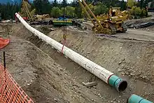 Le « revêtement en bois[13] » (Wood lagging (en)) est une sorte de lattage en bois autour des canalisations, établi pour les protéger des impacts, de l'abrasion et de la corrosion. Le revêtement en bois agit comme une gaine, protégeant le pipeline des accidents, particulièrement utile sur terrains rocheux, pentes raides, autour des rivières ou zones marécageuses, et autres terrains accidentés[14]. Le bois de calfeutrage a été utilisé sur des pipelines notables tels que le Trans-Mountain Pipeline, qui traverse les Rocheuses canadiennes depuis 1953, et le Kinder Morgan TMX Anchor Loop. Ce dernier, construit en 2007, utilisait du bois de scellement dans les terrains et les traversées de rivières écologiquement sensibles du Parc national de Jasper en Alberta.