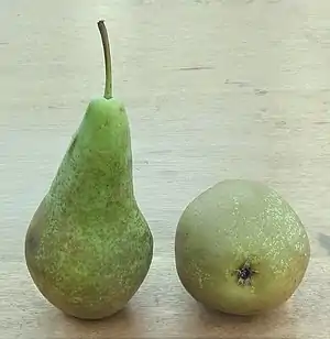 La poire Conférence est une poire à couteau allongée en forme de bouteille, de taille moyenne.
