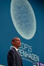Les objectifs visés par l'administration américaine sont une diminution de l'émission des gaz à effet de serre de 17 % d'ici à 2020, 30 % d'ici à 2025 et 42 % d'ici à 2030 par rapport à 2005. À terme, le but est de réduire les émissions de 83 % d'ici à 2050[23]. Mais Todd Stern (envoyé spécial américain pour le climat) conditionne les efforts américains à une participation active des principaux pays en développement[24]. B. Obama est contraint par son Congrès et certains lobbies, et élus de droite très agressifs, voire franchement climatosceptiques (c'est-à-dire ne croyant pas au réchauffement climatique)[25],[26].