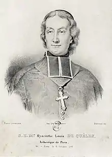 Mgr Hyacinthe-Louis de Quélen, évêque coadjuteur de Mgr Alexandre-Angélique de Talleyrand-Périgord, lui succède à son décès le 20 novembre 1821 sur le siège épiscopal de Paris. Dès le début de son épiscopat, il encourage la fondation de la société missionnaire de France, établie au mont Valérien. Le principe de la mission consiste pour un corps de prêtres missionnaires à séjourner dans les paroisses environ deux mois, à prêcher des “exercices” deux fois par jour et à tenir une permanence de confession. La mission se termine en apothéose par les communions sacramentelles. Le 28 octobre 1821, Mgr de Quelen préside l’ouverture à Saint-Étienne du Mont, ainsi que sur trois autres paroisses environnantes. Cette initiative pastorale est troublée par de nombreux incidents fomentées par des perturbateurs anticléricaux soutenus entre autres par le journal libéral Le Constitutionnel[1]. Les dernières missions diocésaines dans les paroisses se déroulent en décembre 1823 à Saint-Merry, à Saint-Jean-Saint-François et à Notre-Dame des Blancs Manteaux. Elles continuent, dans deux lieux uniquement jusqu’en 1830, à Sainte-Geneviève et au mont Valérien où sont établis les missionnaires, mais le public s’étiole. En 1833, Mgr de Quelen livre la raison de cette interruption dans un mémoire adressé au pape Grégoire XVI où il dénonce l’activisme des anticléricaux et la timidité du pouvoir à faire respecter l’ordre[2].