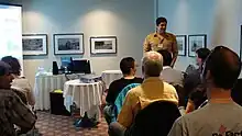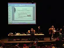 Les participants sont le plus souvent rassemblés en un même lieu (amphithéâtre, salle de conférence parfois situées dans un bâtiment spécialisé (centre de conférence). Au XXe siècle, les conférenciers sont passés du tableau noir, aux diapositives, rétroprojecteur, puis vidéoprojecteur et logiciels spécialisés (ici conférence sur la privatisation des savoirs). Depuis la fin des années 1990, une conférence peut facilement faire intervenir des personnes séparées dans l'espace et dans le temps grâce au téléphone (conférence téléphonique), des enregistrements vidéo ou la visiophonie (visioconférence) ou directement sur Internet via des outils de travail collaboratif).