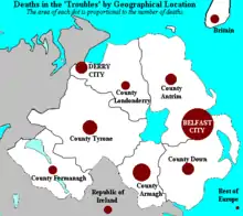 Le conflit nord-irlandais, appelé aussi « The Troubles »[Note 4] (en français : Les Problèmes ; en irlandais : Na Trioblóidi ; en scots : The Truibils), est une période de violences et d'agitation politique en Irlande du Nord dans la seconde moitié du XXe siècle. Il débute à la fin des années 1960[Note 1] et est considéré comme terminé entre 1997 et 2007 selon les interprétations[Note 2]. La violence continue cependant après cette date, mais de façon occasionnelle et à petite échelle, tandis que la plupart des groupes belligérants déposent les armes.