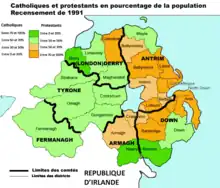 Au nord-est de l'Irlande, pendant la Guerre d'indépendance, les B-Specials, les Black and Tans et les anciens Ulster Volunteers organisent de véritables pogroms anti-catholiques[33]. Le projet de séparer l'Ulster du reste de l'île avait déjà été proposé par Lloyd George en 1916. C'est chose faite en 1920 : les comtés d'Antrim, d'Armagh, de Derry et de Down, à majorité protestante, ainsi que les comtés de Fermanagh et de Tyrone, à majorité catholique[34], sont placés sous le contrôle du Parlement d'Irlande du Nord par le Government of Ireland Act 1920[F 14]. Le nouvel État organise une véritable discrimination politique, économique et sociale de la minorité catholique, tandis que s'affirment ses liens étroits avec l'Ordre d'Orange[35],[36].