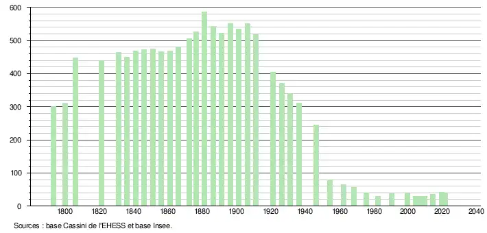 L'évolution du nombre d'habitants est connue à travers les recensements de la population effectués dans la commune depuis 1793. Pour les communes de moins de 10 000 habitants, une enquête de recensement portant sur toute la population est réalisée tous les cinq ans, les populations légales des années intermédiaires étant quant à elles estimées par interpolation ou extrapolation[29]. Pour la commune, le premier recensement exhaustif entrant dans le cadre du nouveau dispositif a été réalisé en 2004[30].