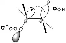 ![]()  Figure 6 : l’orbitale de la liaison C–H est alignée sur l’orbitale antiliante de C–Cl et il se produit un phénomène d'hyperconjugaison.   |