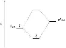 ![]()  Figure 7 : l’énergie des orbitales liante de C–H et antiliante de C–Cl est plus basse lorsqu’elles se mélangent.   |