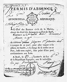 En France, autrefois, les marins n’avaient pas la liberté de quitter librement leur service. Ils devaient avoir une autorisation pour quitter le bord, sinon l’abandon du navire était une désertion c'est-à-dire un crime[1]. Le congé de marin servait de passeport ou laissez-passer entre le port de débarquement et son foyer, lui évitant d'être soupçonné de désertion ou de vagabondage par la gendarmerie. Les conditions d'octroi du congé étaient fixées par le décret du 9 novembre 1853. Lorsque le congé était temporaire et inférieur à 30 jours, on parlait de permission. En cas de sortie de l'armée, le congé était dit « définitif » ou « absolu »[2].