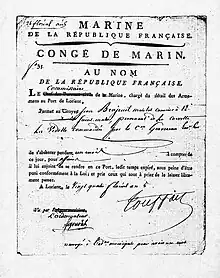 Le congé de marin était un document remis à un marin naviguant pour l'État, un militaire, l'autorisant à quitter le service selon les conditions légales.