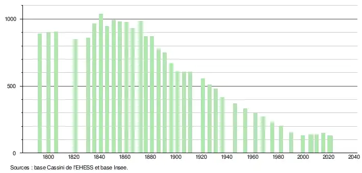 L'évolution du nombre d'habitants est connue à travers les recensements de la population effectués dans la commune depuis 1793. Pour les communes de moins de 10 000 habitants, une enquête de recensement portant sur toute la population est réalisée tous les cinq ans, les populations légales des années intermédiaires étant quant à elles estimées par interpolation ou extrapolation[18]. Pour la commune, le premier recensement exhaustif entrant dans le cadre du nouveau dispositif a été réalisé en 2005[19].