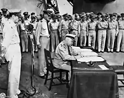 À bord du Missouri, baie de Tokyo, . L'amiral Conrad Helfrich signe les actes de capitulation du Japon au nom du royaume des Pays-Bas. Derrière lui, au microphone, le général Douglas MacArthur.