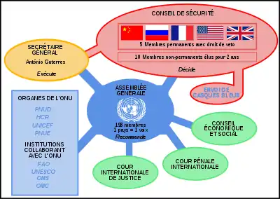 Le Conseil de sécurité est composé de quinze membres : cinq permanents pourvus du droit de veto (Chine, États-Unis, France, Royaume-Uni, Russie) et dix élus pour une durée de deux ans (renouvelés par moitié tous les ans).