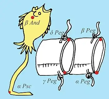 Dans le ciel traditionnel arabe formalisé autour des manāzil al-qamar ou « stations lunaires », les Anciens Arabes plaçaient la 28e station, formée par l’étoile β And et nommée الحوت al-Ḥūt, leur « Poisson », nom qui deviendra par l suite بطب الحوت « le Ventre du Poisson ». Elle suit deux stations formées, dans l’espace gréco-arabe, aux côtés verticaux du Carré de Pégase, qui est pour eux الدلو al-Dalw, « les Dalou », c’est-à-dire le seau de cuir du puits : la première, soit la 26e, formée par αβ Peg est المقدّم الفرغ, al-Farġ al-Muqaddam, « l’Ouverture Antérieure », et la 27e, formée par γδ Peg, المٶخّر الفرغ al-Farġ al-Mu’aḫḫar, « l’Ouverture Postérieure ». Dans cette scène céleste venue directement de Mésopotamie, on ne retrouve qu’un seul Poisson, venu par l'araméen נונא Nūna, nom singulier que l’on trouve dans certains zodiaques araméens, et l'akkadien Rikis Nūni, « le Cordon du Poisson », qui donne l’arabe الرشاء al-Rišā’, également « le Cordon »[10].