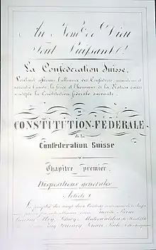 La Constitution fédérale de la Confédération suisse organise le fonctionnement de la Confédération suisse depuis l'État fédéral de 1848 et ses rapports avec les cantons, garantit un certain nombre de droits aux citoyens et oriente les buts sociaux de sa politique[1]. La version actuellement en vigueur est la troisième constitution de la Suisse, après celles de 1848 et de 1874. Elle a été acceptée à la double majorité des cantons et du peuple suisse le et est entrée en vigueur le . Depuis, elle a été modifiée plusieurs fois à la suite de votations populaires[2].