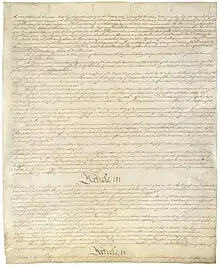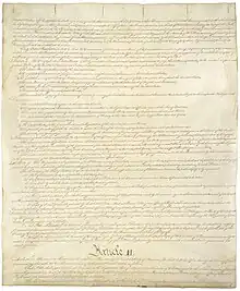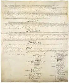La nature et les droits de l'exécutif, et d'autres points, sont encore âprement discutés, mais sans donner lieu au même type de conflit et de blocage entre des camps bien définis. Le projet de constitution est adopté le , et signé par 39 représentants sur les 42 présents[17],[18] : George Mason, Edmund Randolph et Elbridge Gerry refusèrent d'apposer leurs signatures sur le document. Celui-ci fut ensuite transmis au Congrès. Bien que certains soient mécontents que la convention ait si nettement outrepassé son mandat, qui devait se limiter à proposer des améliorations aux articles de confédération, le Congrès transmet le projet de constitution aux États pour ratification.