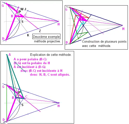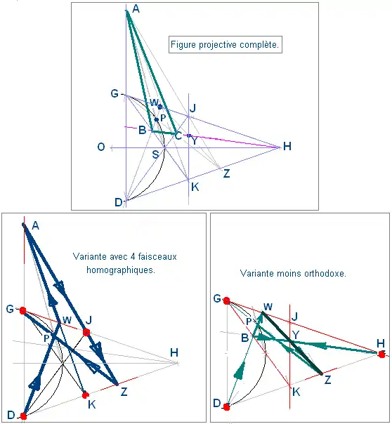 Ici la géométrie projective garantit que B, C et H sont alignés sur la polaire de A. La conique est définie par les points G, S et D et les tangentes GH et DH, soit 5 éléments. La transformation homographique T qui transforme la droite (WBD) en (BCH) puis (CGZ) nous garantit que l'intersection P appartient à la conique. La figure est suffisamment riche pour que l'on puisse trouver 2 variantes de compositions de transformations qui aboutissent à T.