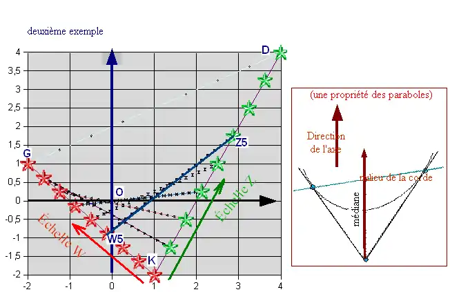 Dans l'ellipse y=(1/4)* x², si W a pour abscisse w, alors la longueur GW mesure (1-w)√2, la longueur KZ mesure (2+w)√5, l'élimination de Z entre les deux conduit à la correspondance entre les points des deux échelles: KZ = √5(3-GW/√2), qui n'est qu'un cas particulier et dégénéré de la fonction homographique