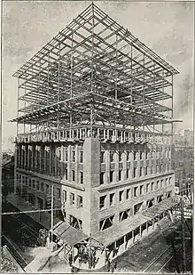 Le Home Insurance Building à Chicago, achevé en 1885, a été le premier à utiliser une construction à ossature, supprimant complètement la fonction porteuse de son revêtement en maçonnerie. Dans ce cas, les colonnes en fer sont simplement encastrées dans les murs et leur capacité de charge semble être secondaire par rapport à la capacité de la maçonnerie, en particulier pour les charges de vent. Aux États-Unis, le premier bâtiment à ossature d'acier fut le Rand McNally Building (en) à Chicago, érigé en 1890.